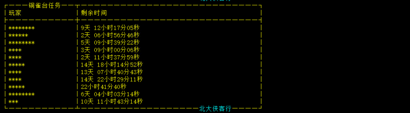 『完成』如果在规定时间内完成所有任务,在铜雀台用complete命令完成,无法完成使用abandon放弃,小铜雀台safari -complete。